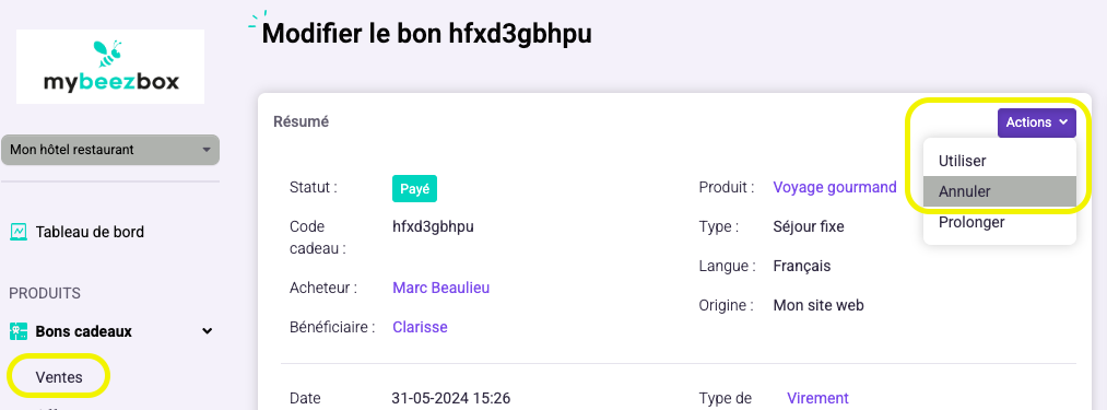 - Espere la confirmación de la acción (aparecerá un mensaje verde en la parte inferior derecha y el estado del bono cambiará de "pagado" a "cancelado").