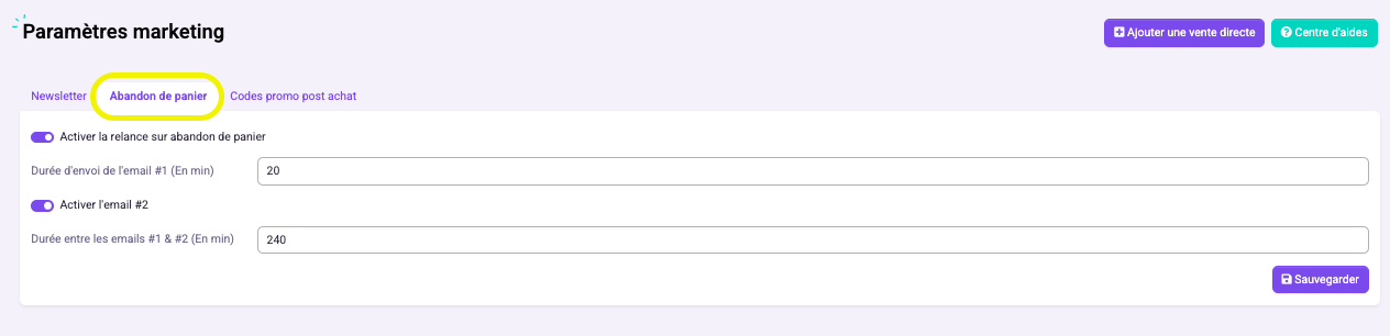 3- Pestaña de abandono del carrito: en las opciones de marketing, seleccione la pestaña "Abandono del carrito". Activar correos electrónicos de recordatorio: