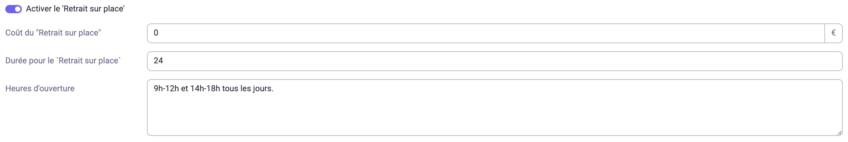 haciendo clic en los botones junto a “Activar la recogida en el establecimiento” y/o “Activar el envío a domicilio”.