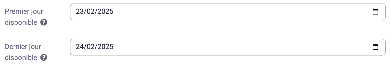 6- Complétez les champs "Premier jour disponible" et "Dernier jour disponible". Par exemple, si vous souhaitez que la formule soit disponible que le 23 et 24/02/2025, il faut indiquer les dates dans les champs suivants :
