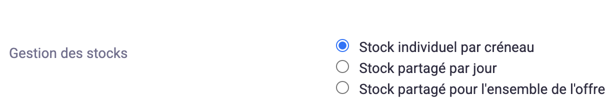 - Stock individuel par créneau : comportement par défaut. Une quantité est valable pour une formule donnée pour chaque créneau. (ex : j'ai 4 "foie gras", j'aurais 4 "foie gras" sur chaque créneaux)